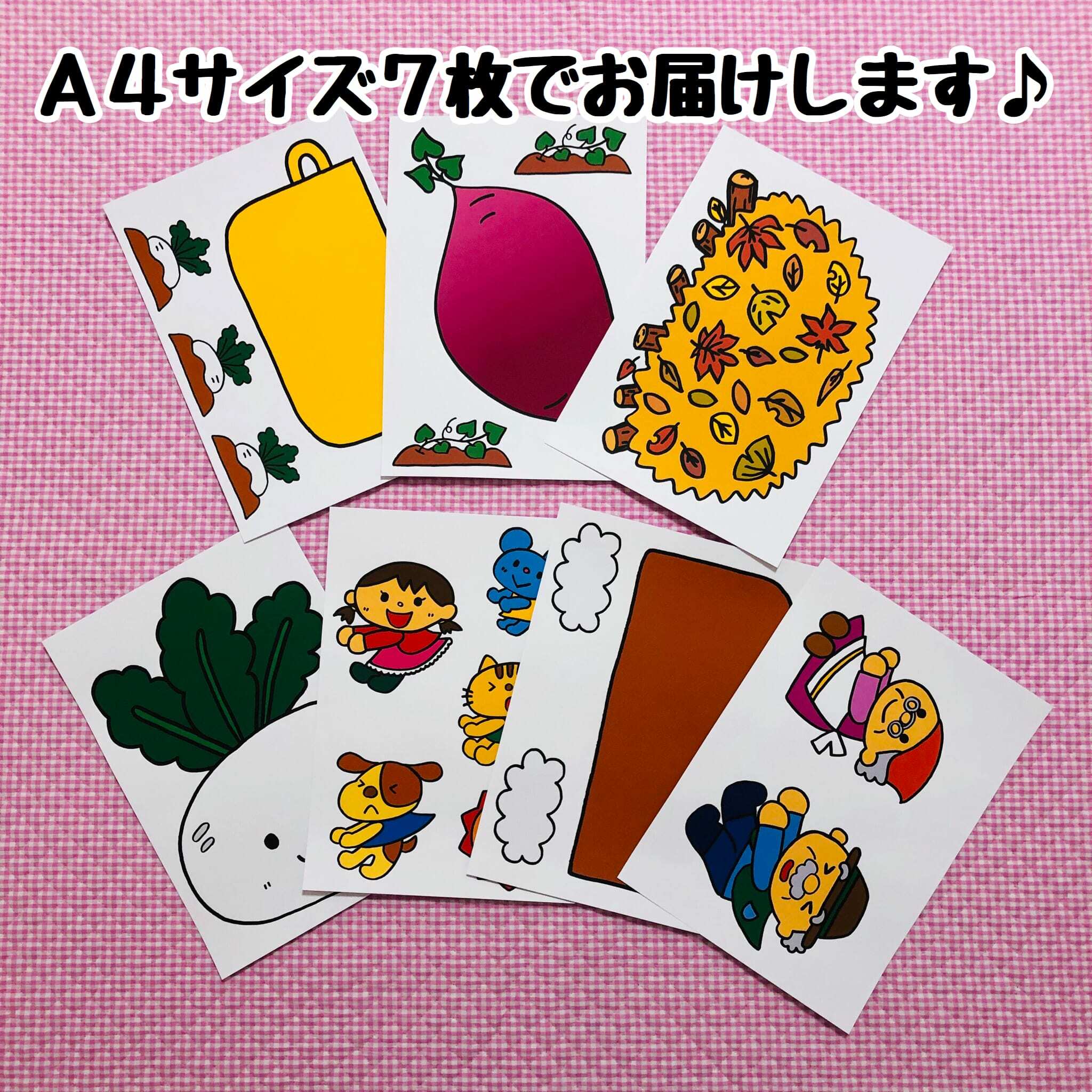 ◆A4サイズのパネルシアター用の用紙(インクジェット印刷対応Pペーパー)に印刷したものを7枚お送りします。